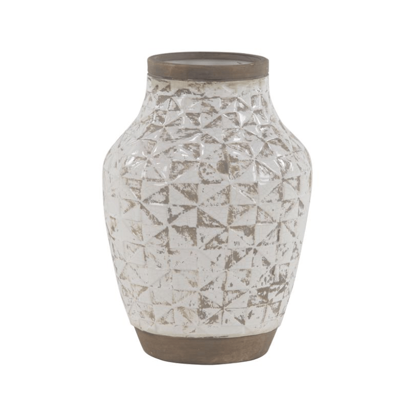 - Cuenta con diseños de patrones geométricos exteriores en un jarrón redondo en forma de urna.