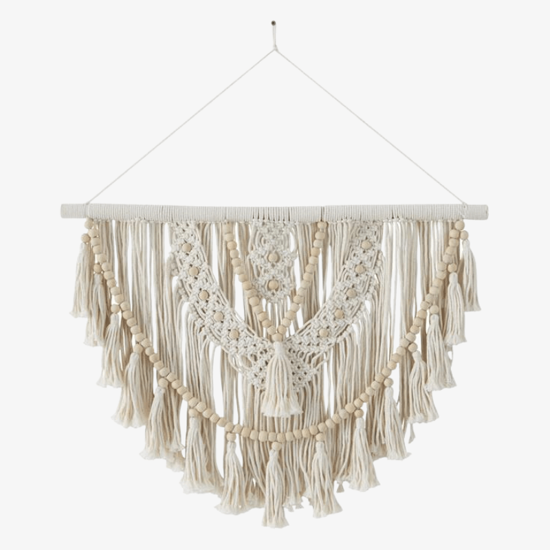 - El tapiz de pared boho chic en forma de media luna lleva diseños de cortina y macramé.
