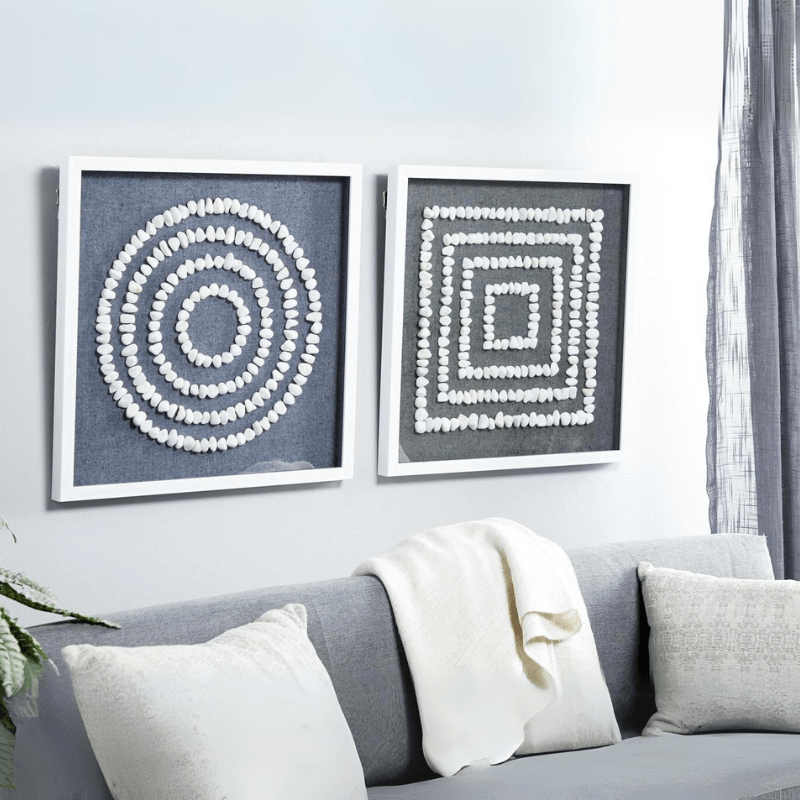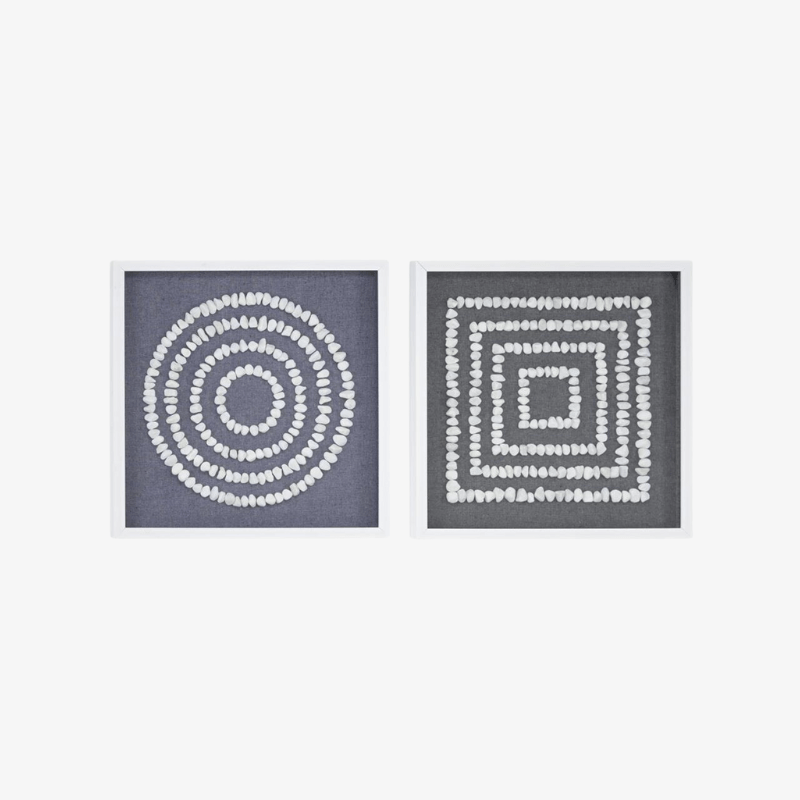 - Info.Arte de pared geométrico con fondo de tela similar al denim gris y fondo de tela similar al denim azul oscuro, cada uno con piedras y guijarros redondos, blancos y dimensionales; patrón radial de 4 capas sobre fondo azul y patrón cuadrado de 4 capas sobre fondo gris; marcos de caja de sombra