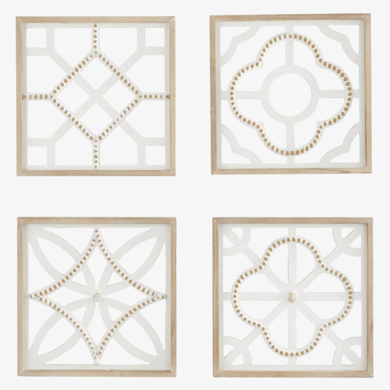 - El juego de 4 cuadros de madera para pared viene en acabado blanco y marrón claro con detalles desgastados en todas partes.