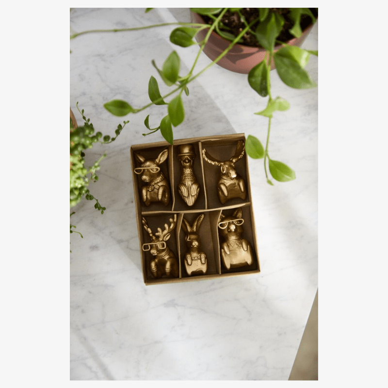 Prepara tus macetas para las fiestas con tus personajes favoritos de E+E gracias al set de 6 figuras decorativas E+E Huggers de resina dorada antigua. Incluye a Frankie el ciervo, Margie la cierva, Eugene el alce, Eric el conejo, Eloise la zorra y Emerson el faisán. Estas figuras están diseñadas para colocarse en el borde de macetas, jarrones o recipientes y añadir un toque festivo y alegre.