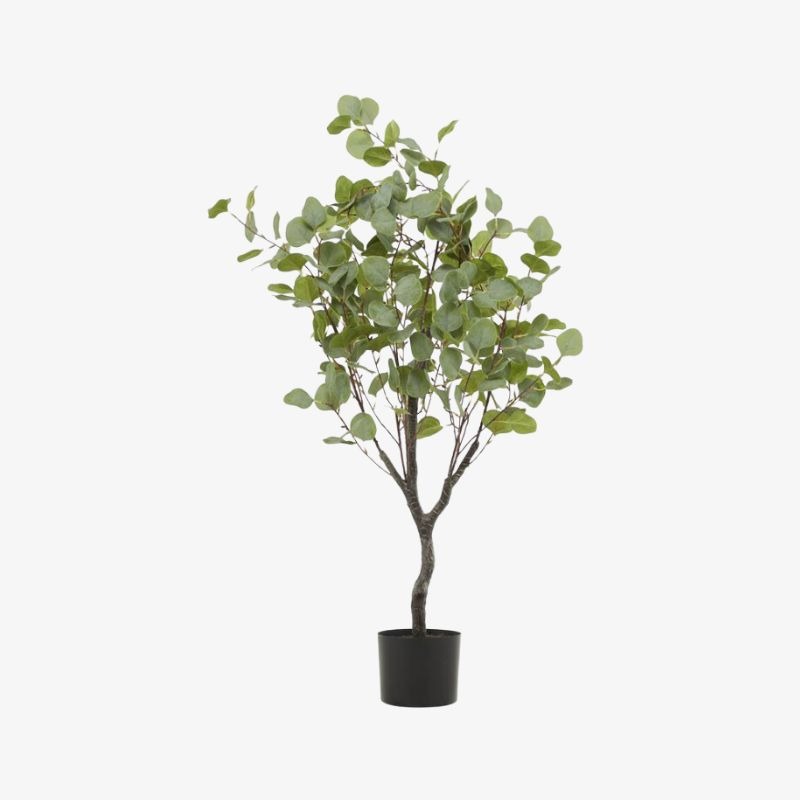 Árbol eucapilto artificial tiene hojas verdes, ramas marrón caoba y un tronco marrón texturizado con una maceta negra