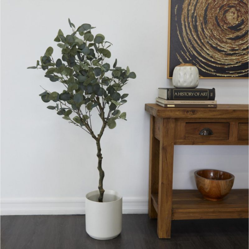 El árbol decorativo de interior es una réplica artificial de un eucalipto con pequeñas hojas redondas de venación realista y una maceta alta y sencilla para una presentación equilibrada