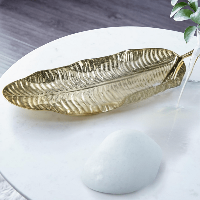 Organiza y decora con un estilo elegante y excéntrico con esta bandeja decorativa con acabado dorado que puedes colocar en tus mostradores o mesas de consola de estilo contemporáneo.