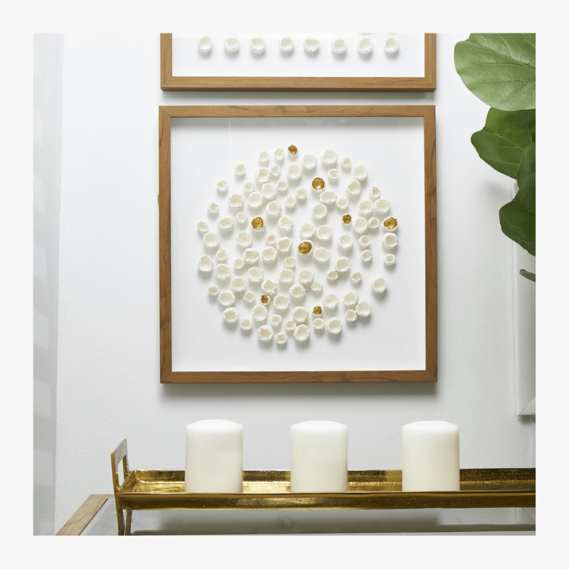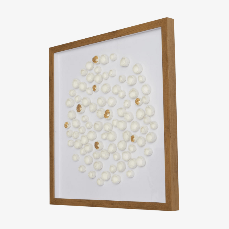 - Formas circulares únicas sobre un fondo y marco de madera y mdf, bajo cristal