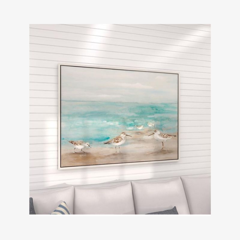 Este lienzo enmarcado para pared presenta un paisaje inspirado en el estilo costero con pájaros en la costa.