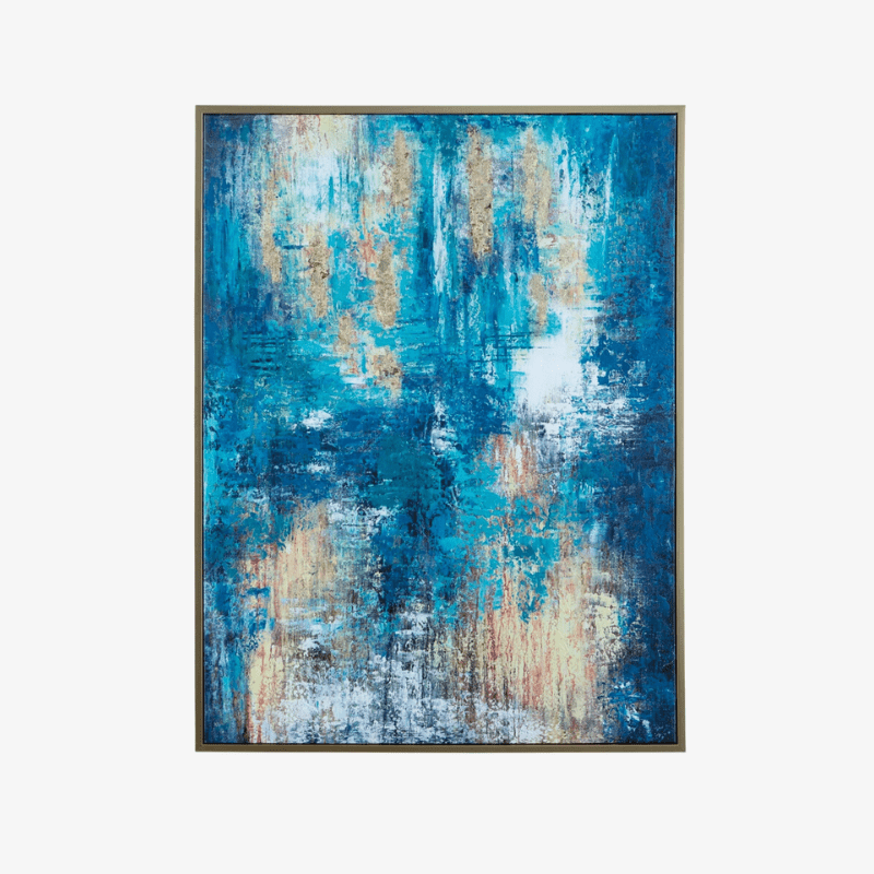 Consigue un ambiente elegante y contemporáneo con el diseño abstracto del mural Scarlite. Sus tonos fríos se combinan a la perfección con tonos óxido y dorados para añadir profundidad y dimensión. Un adorno de hojas doradas le da un toque de glamour.