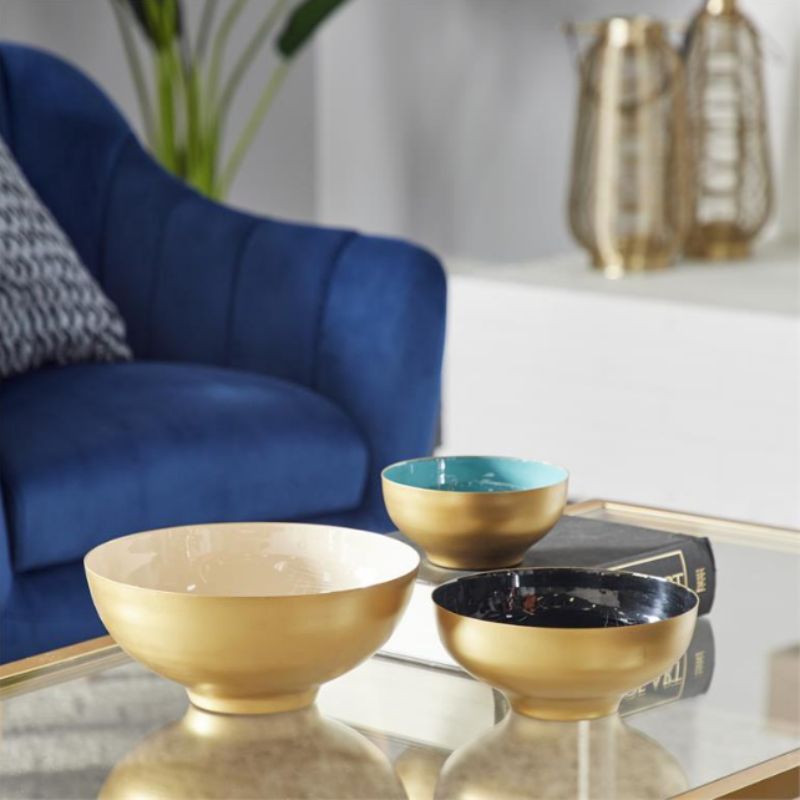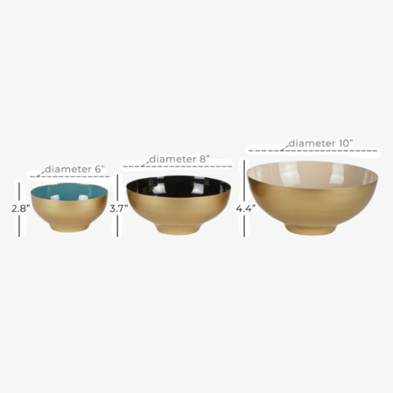Estos cuencos de metal esmaltado vienen en exterior dorado mate con interior rosa claro, negro y verde