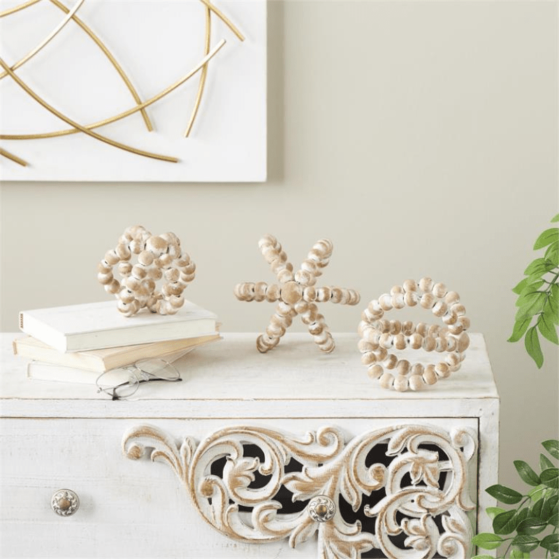 Elaboradas con madera desgastada de alta calidad y cuentas hechas a mano, estas esculturas combinan a la perfección elementos naturales para evocar un ambiente bohemio.