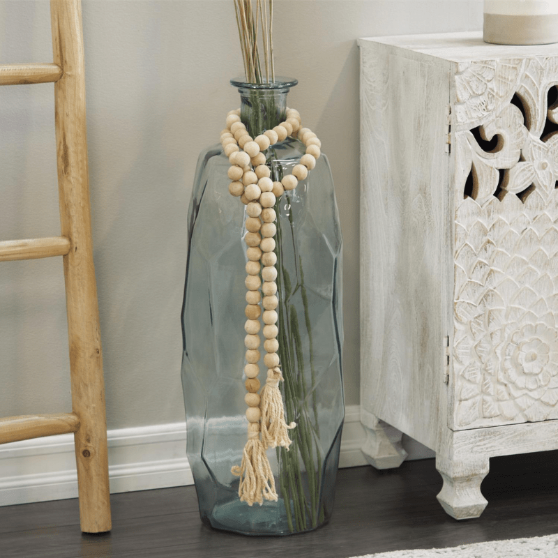 La guirnalda de cuentas marrón claro con borla está hecha con madera de mango y algodón para un diseño duradero y orgánico.