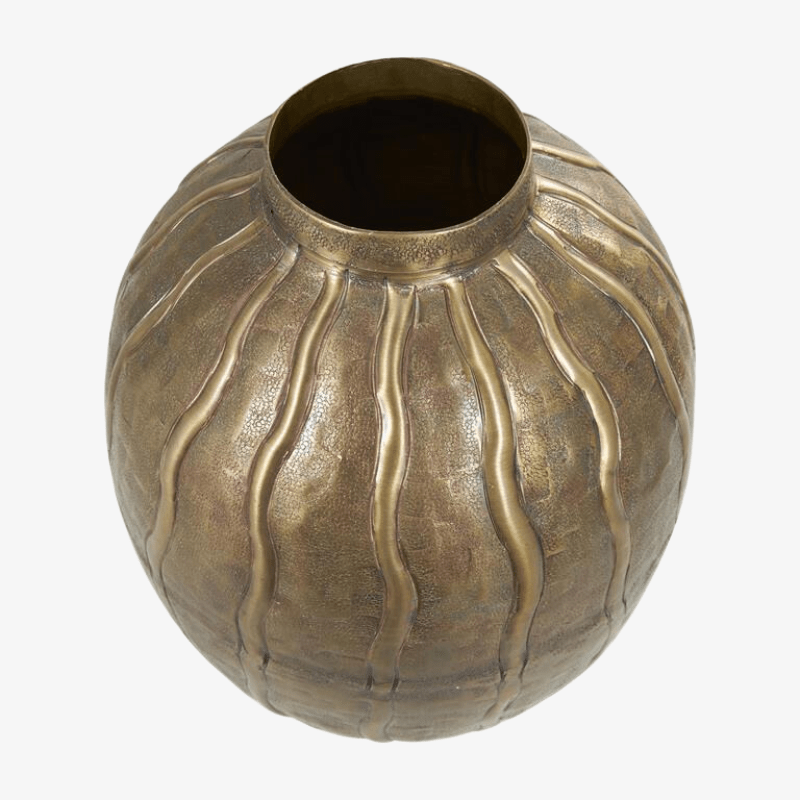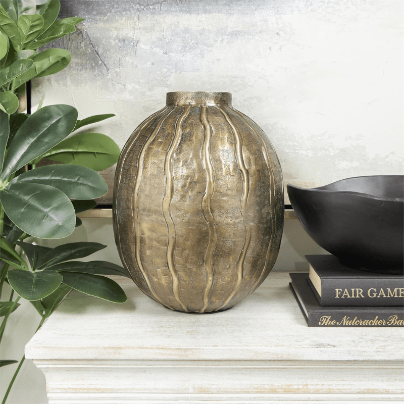 El jarrón inspirado en la piel de serpiente cuenta con un acabado dorado glamuroso y brillante, perfecto para añadir un toque de lujo a tu espacio.