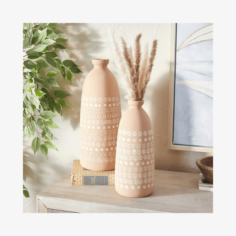 Juego de jarrones de gres con un acabado rosa y beige mate con motivos estampados en blanco