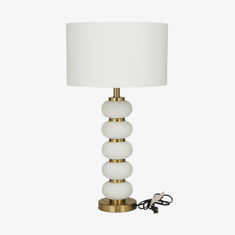 La lámpara de mesa final blanca destaca una pantalla en forma de tambor con un poste de lámpara cilíndrico acentuado por un orbe en forma de oblongo con una base redonda