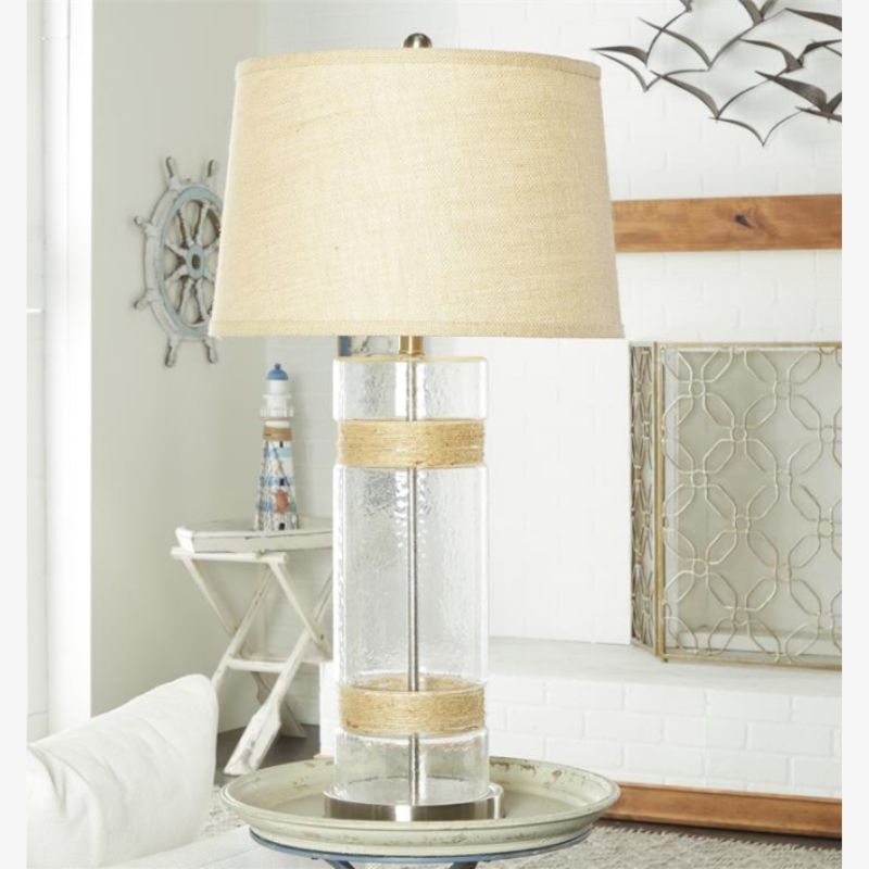 - Fabricado de cristal, detalles de cuerda de yute, base y tija de hierro, pantalla de lino