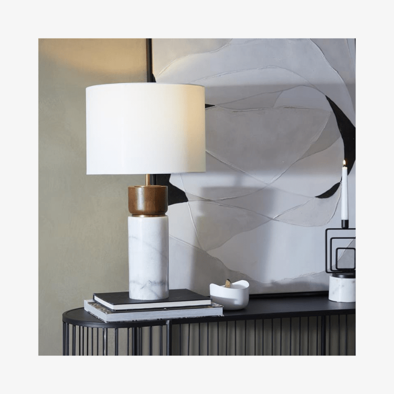 La lámpara de mesa redonda tiene un acabado de mármol blanco natural con pantalla blanca y se complementa con madera marrón con detalles dorados