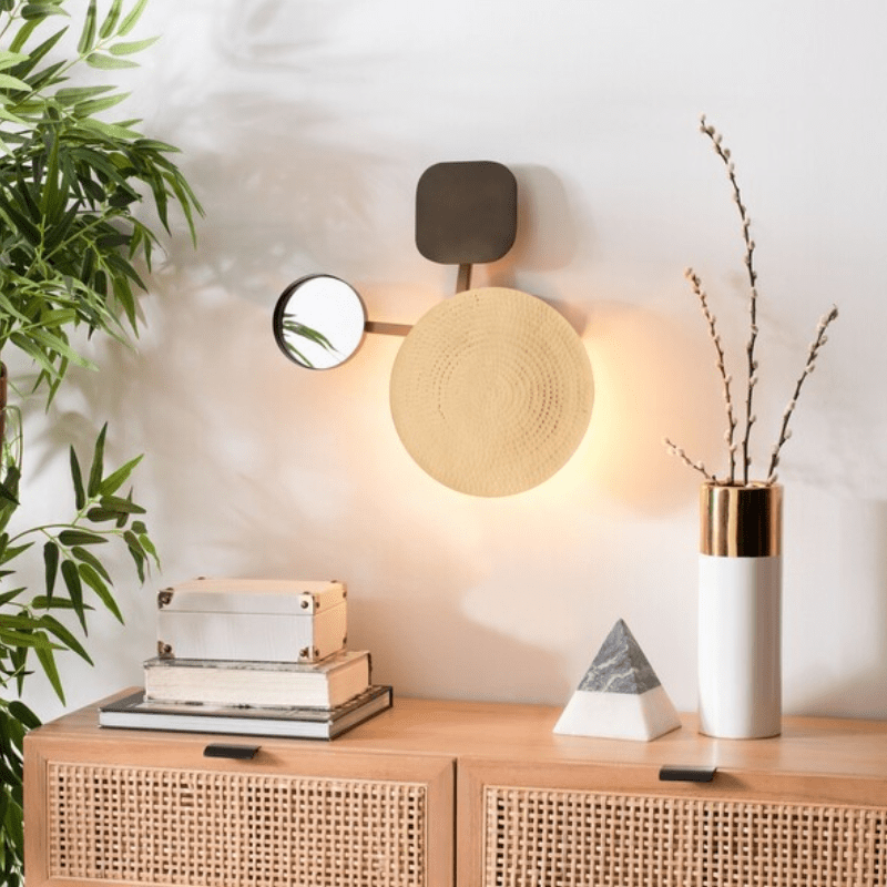 Dale un toque de glamour a tus paredes con el estilo artístico y la riqueza de texturas de nuestra decoración de pared Olosa. La decoración geométrica de pared juega con el tamaño, las proporciones y las texturas para lograr una composición sofisticada y llamativa. El acabado en latón antiguo envejecido se yuxtapone a una hermosa textura martillada. Combinada con la superficie reflectante de un espejo, nuestra decoración de pared eleva su hogar con una mezcla de materiales refinados. Difunde una luz suave contra la pared para añadir carácter e interés visual a sus paredes. Ideal para zona de escaleras o pasillos.