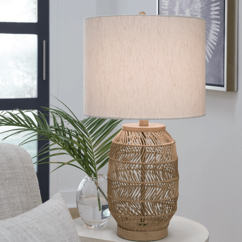 Adopte una dosis perfecta de estilo boho-chic playero y moderno. Su aspecto orgánico, con una base de ratán natural sobre una estructura de metal, es perfecto para una gran variedad de interiores. En la parte superior hay una pantalla de tambor de tela blanca. En la parte inferior, un pedestal redondo de color beige contrasta con el ratán y la pantalla.