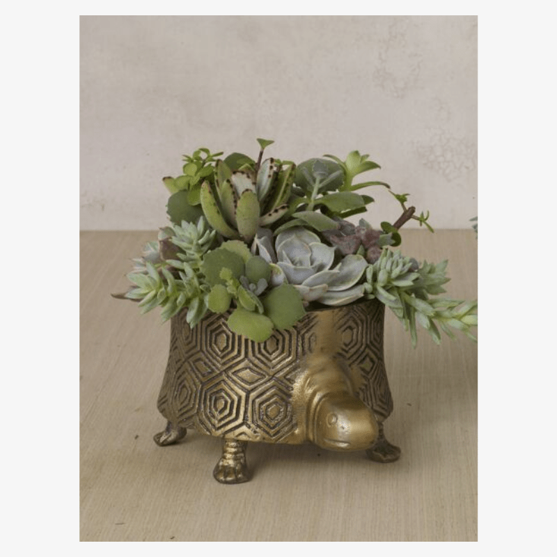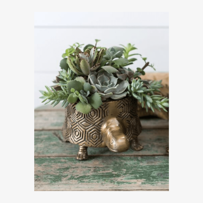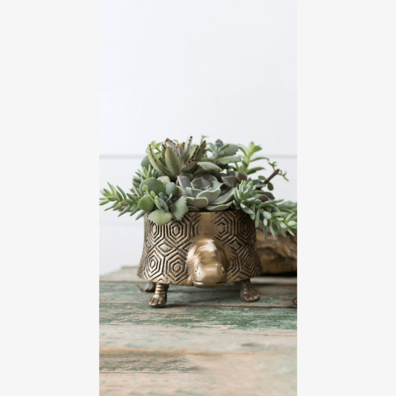 Nos encantan estas adorables macetas de metal con su diseño de tortuga y acabados en oro antiguo.
