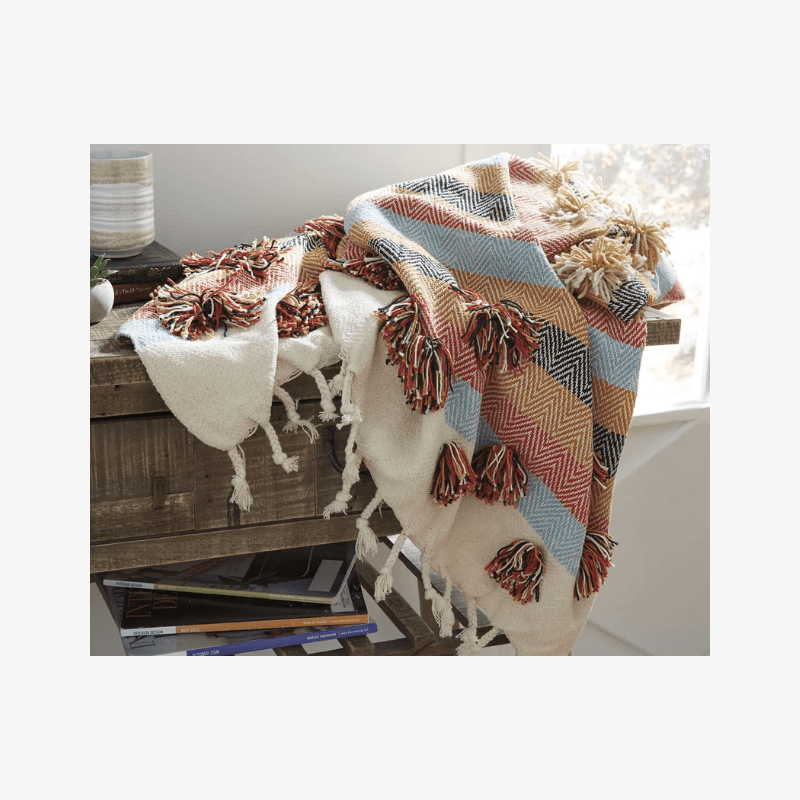 Rica en texturas en relieve y rebosante de colores tierra, la manta Jacinta lleva el estilo boho-chic a otro nivel.