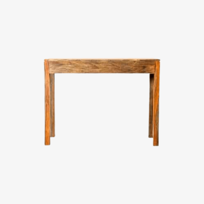 Tómate un momento para admirar el acabado castaño de esta mesa consola. Su diseño llamativo pero simplista es todo lo que necesita para una entrada o espacio habitable funcional. Construidos con sheesham, dos cajones se abren sobre guías metálicas con facilidad. Las patas altas y de estilo bloque brindan un amplio soporte. Esta pieza fue elaborada en la India.