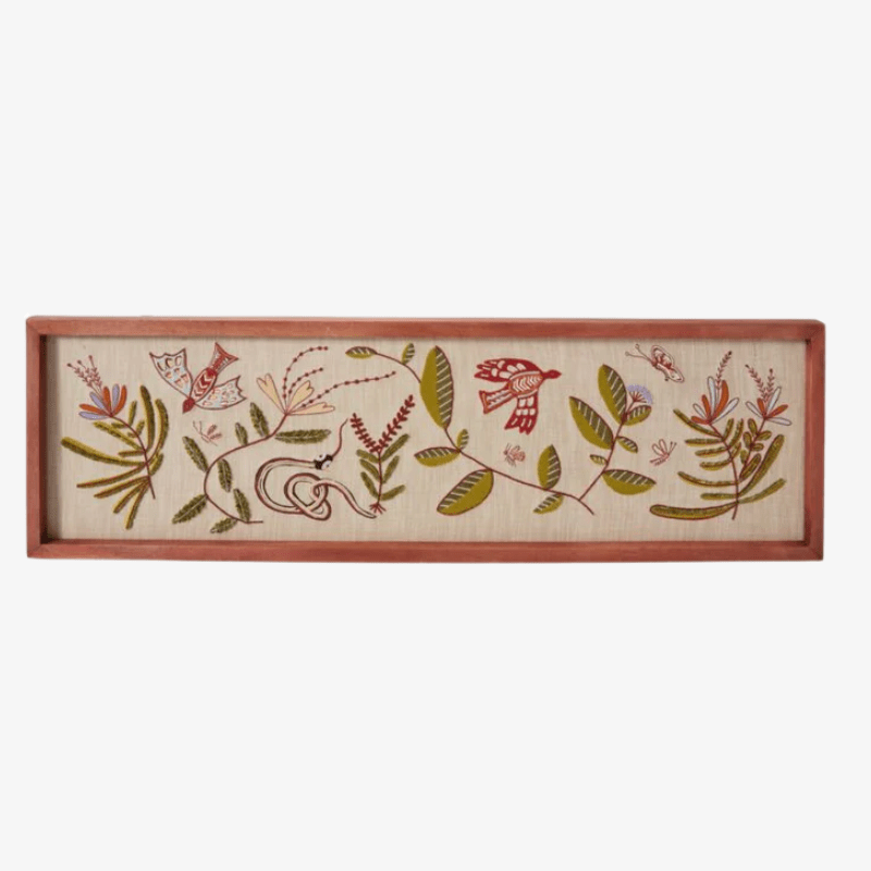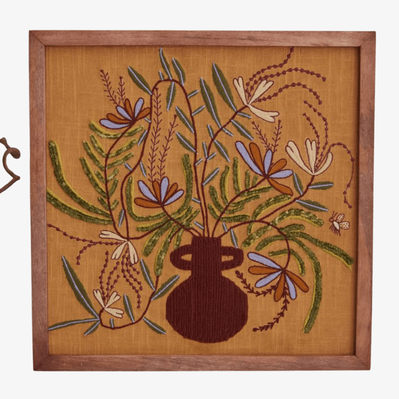 El cuadro cuadrado bordado «Andalucía» rebosa personalidad con su singular diseño floral y de jarrón, realizado con diversas técnicas de bordado sobre un fondo de algodón flameado. Esta pieza decorativa aporta un toque rústico y artesanal a la pared.