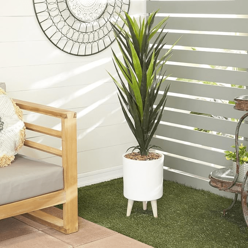 Esta encantadora planta artificial en maceta muestra un diseño de planta de hoja puntiaguda alta con rellenos de piedra mixta natural y una gran maceta redonda de polietileno con patas de madera de goma trípode elegantes.