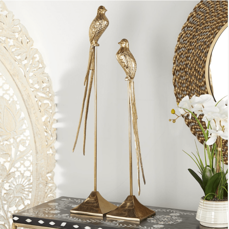 El juego de esculturas decorativas doradas está hecho de aluminio de alta calidad, lo que garantiza su durabilidad y belleza duradera. El acabado dorado satinado resalta los detalles de este conjunto de estatuas decorativas de pájaros, mostrando un espectro de tonos metálicos.