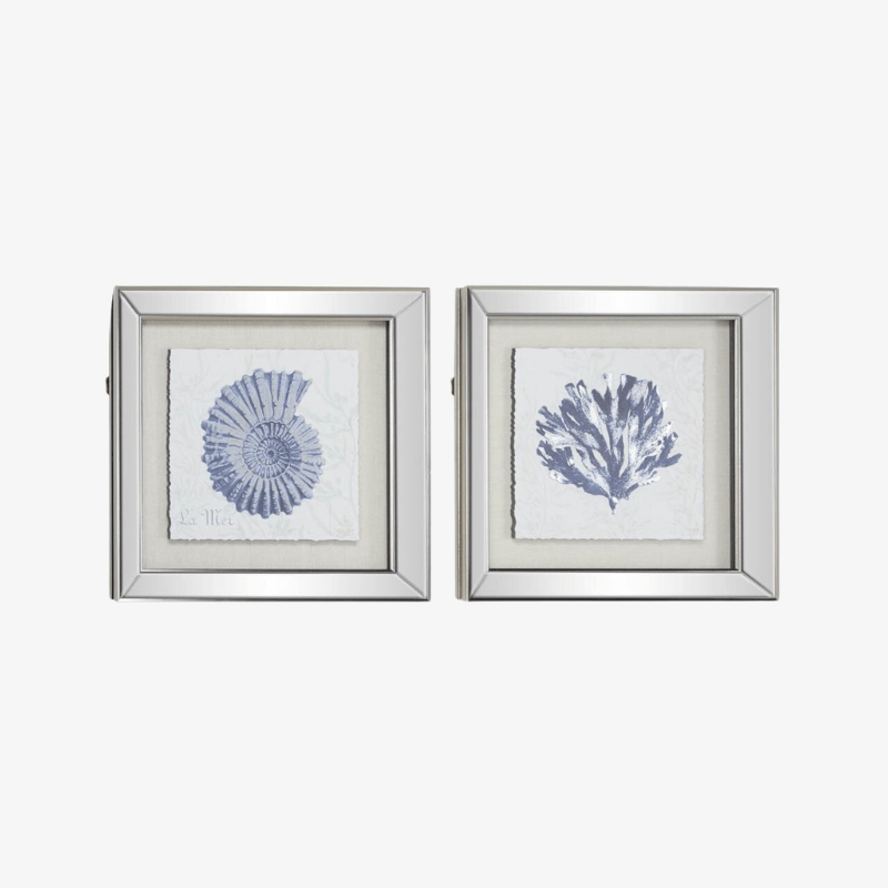 • Info.Arte de pared geométrico con fondo de tela similar al denim gris y fondo de tela similar al denim azul oscuro, cada uno con piedras y guijarros redondos, blancos y dimensionales; patrón radial de 4 capas sobre fondo azul y patrón cuadrado de 4 capas sobre fondo gris; marcos de caja de sombra