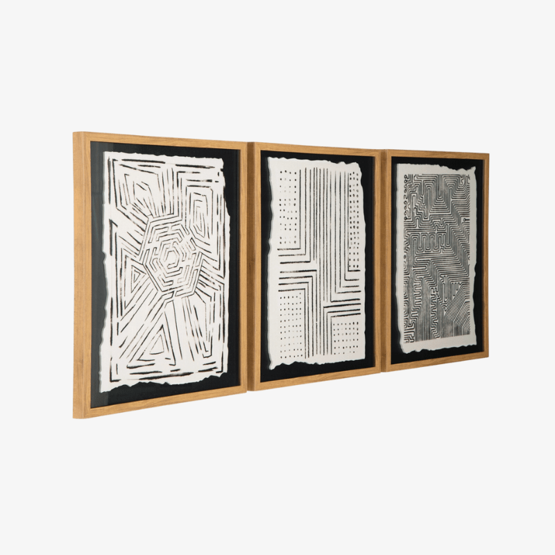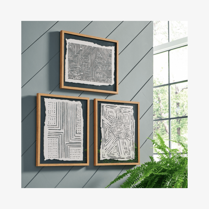 Domina el minimalismo y el movimiento con el conjunto de cuadros Wonderstow. Los diseños geométricos aportan un toque de interés visual, mientras que el negro y el beige mantienen la paleta de colores en su sitio. Coloca las tres piezas juntas o cuélgalas por separado para mantener una estética coherente en varias habitaciones.