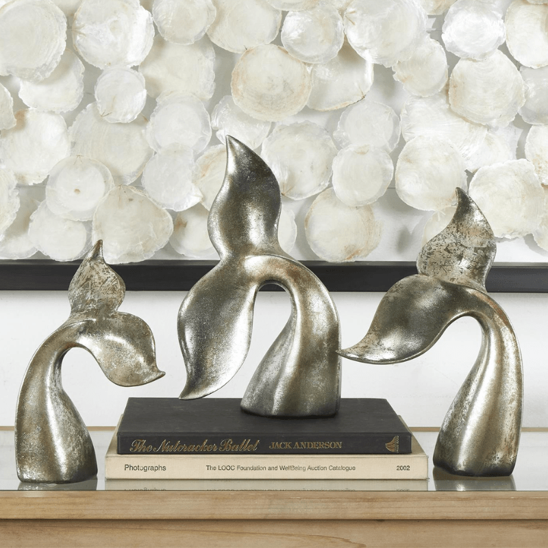 - La resina está moldeada para formar una escultura de cola de ballena con un patrón sólido.
