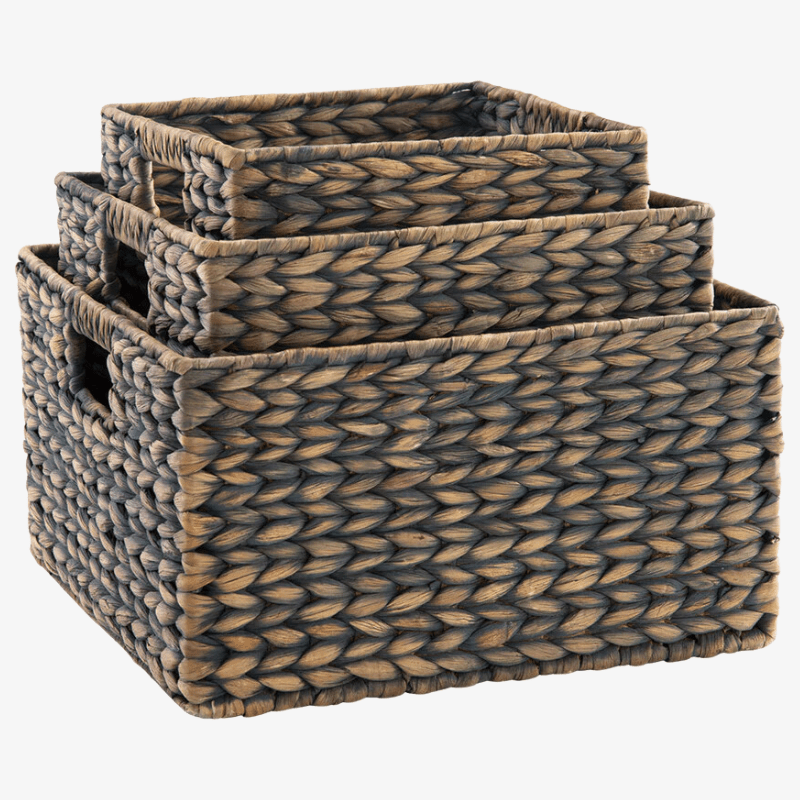 Haga que su casa de campo moderna o su acogedora cabaña sean mucho más pintorescas con una canasta de almacenamiento en su espacio. Hechas de jacinto natural tejido con un acabado gris envejecido, estas canastas seguramente irán con la corriente.