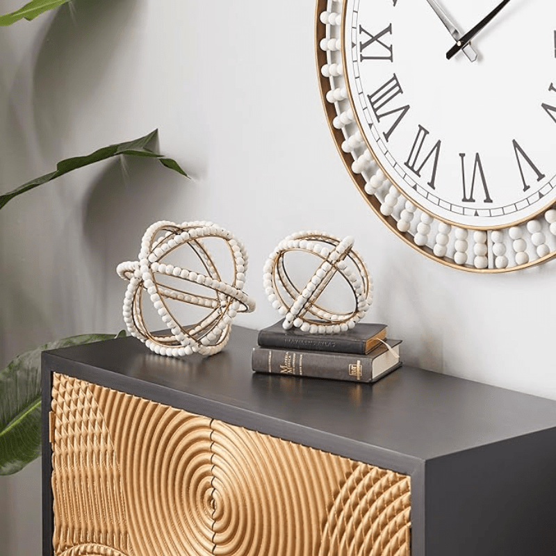 Las abalorio de madera blanca alinean las secciones interiores de los cables metálicos dorados que se forman en un orbe decorativo que proporciona textura y visualización dimensional audaz en cualquier superficie.