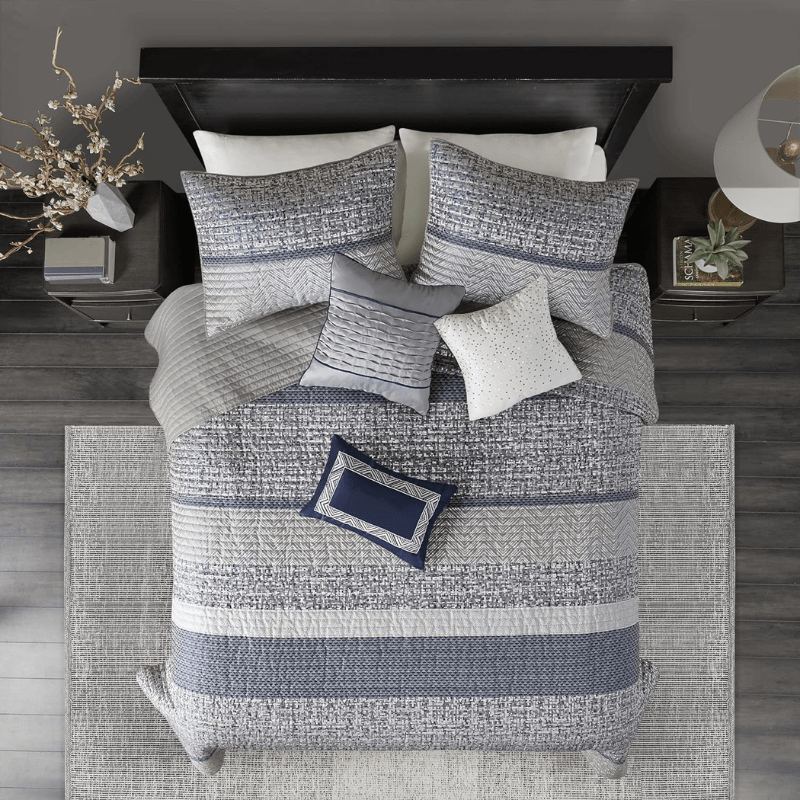 Dale a tu dormitorio un nuevo aspecto lujoso con el juego de colcha reversible de 6 piezas Madison Park Rhapsody. Esta colcha reversible presenta un diseño de rayas marinas y grises con varios motivos diferentes en la cara con un reverso gris sólido, para un aspecto de transición elegante.