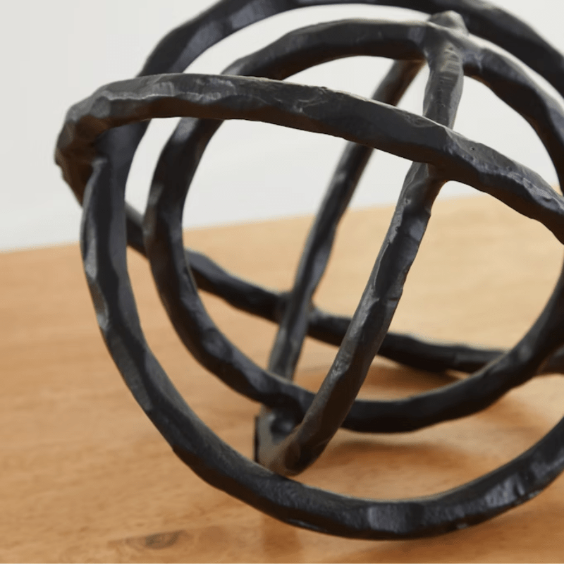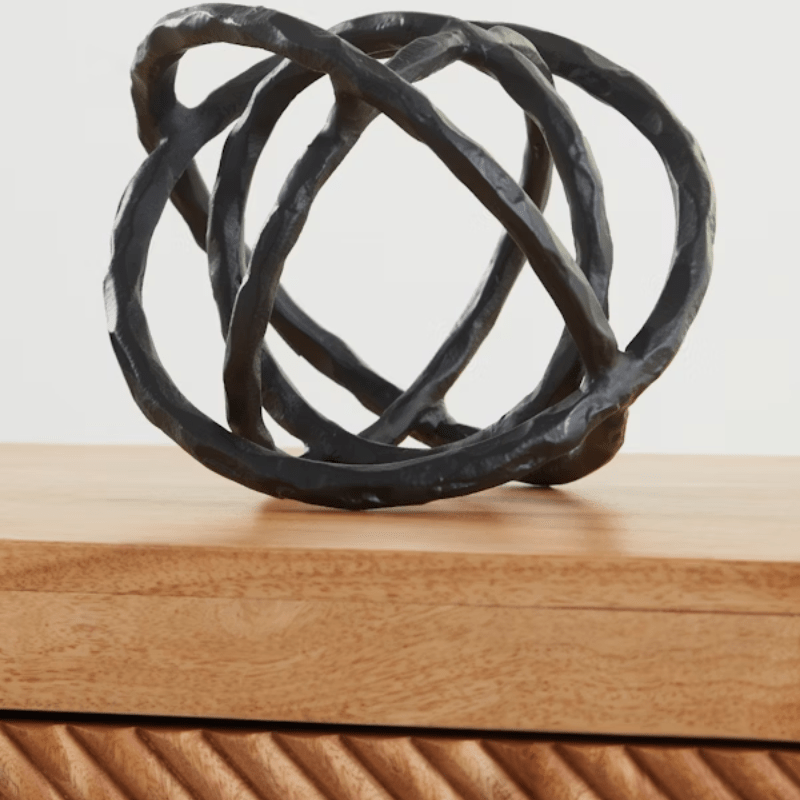 Esta escultura cierra el círculo del arte contemporáneo. Los anillos de metal entrelazados con acabado negro añaden un toque de galería de arte a una mesa consola, estantería o repisa.