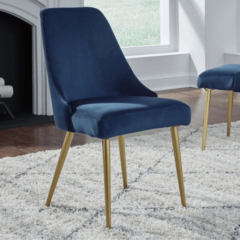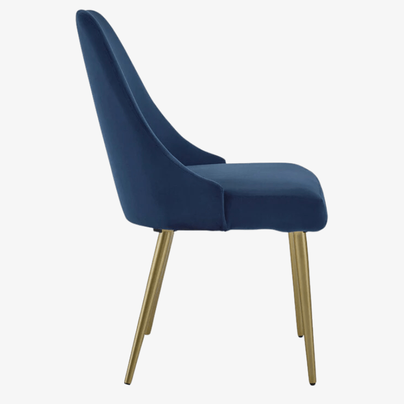 Esta silla cubo combina un diseño moderno y contemporáneo con la comodidad acolchada de una silla de comedor tapizada. Las resplandecientes patas doradas combinadas con el audaz terciopelo azul crean un aspecto lustroso que es fresco y con visión de futuro. Utilice este elegante asiento en cualquier lugar que necesite un toque de brillo.